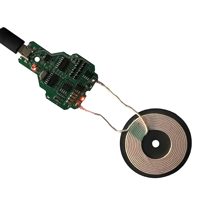 El cargador inalámbrico PCB tiene una bobina transmisora que puede generar un campo electromagnético alterno cuando recibe alimentación. Cuando se conecta al dispositivo, el campo magnético induce una corriente en la bobina receptora y la convierte de nuevo en energía eléctrica para cargar el dispositivo.